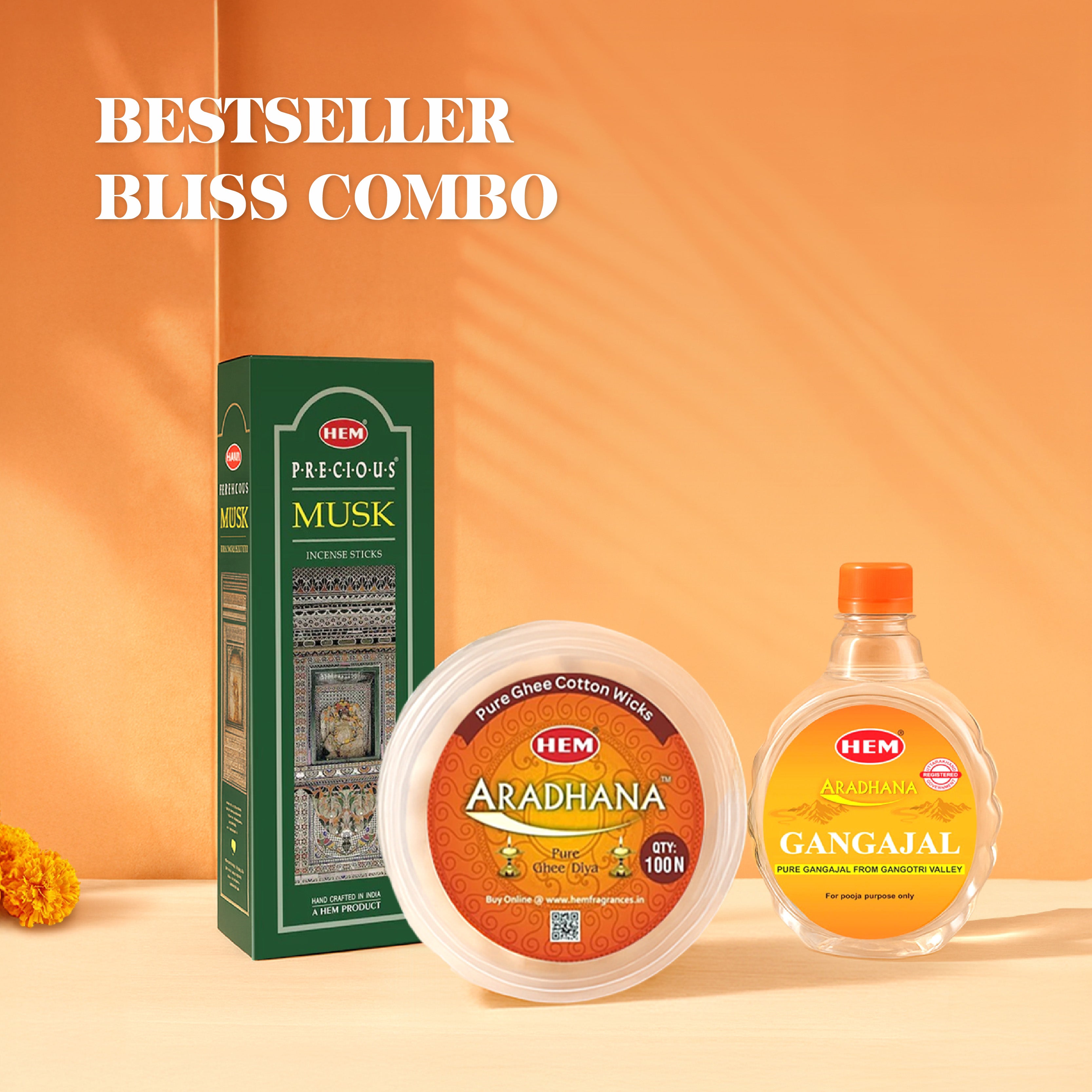 Bestseller Bliss (HEM Aradhana Gangajal + HEM Precious Musk Incense Sticks + HEM Aradhana Pure Ghee Diya 100 pieces)